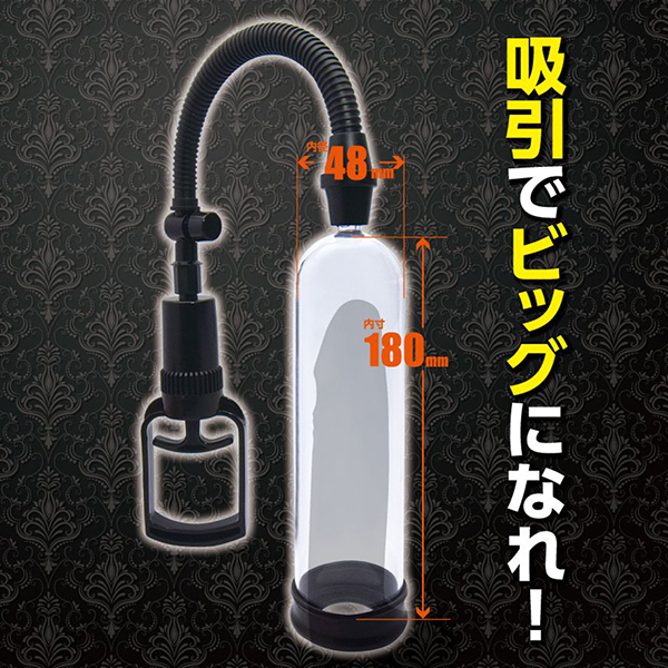 吸引でビッグになれ!強い男になるために開発された増大ポンプ「BIGBOY PUMP(ビッグボーイポンプ)」が新登場!簡単に片手で握れるトリガーレバーにワンプッシュの圧力開放ボタン、さらには大きさが目で分かる透明シリンダー、サイズが選べる3種類のゴムパッキンと操作性や視認性も抜群♪必要なものがすべて揃っていて、あとはレバーを握って空気を吸って、吸引圧力でメンズをビッグにするだけ!トリガーレバーは手動式なので微細な調整もコントロールも簡単♪圧力開放ボタンは安心設計でワンプッシュで吸引キャンセル!シリンダーは憧れサイズにぴったりな内寸長180ミリ×内径48ミリとなっています。