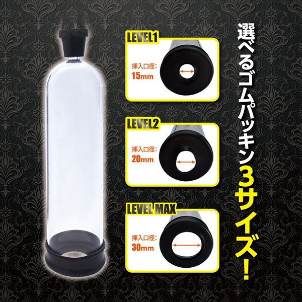 挿入口のゴムパッキンは、選べる3サイズ(15ミリ、20ミリ、30ミリ)!シンプルながらもじっくり増大を計画しているならおすすめです♪