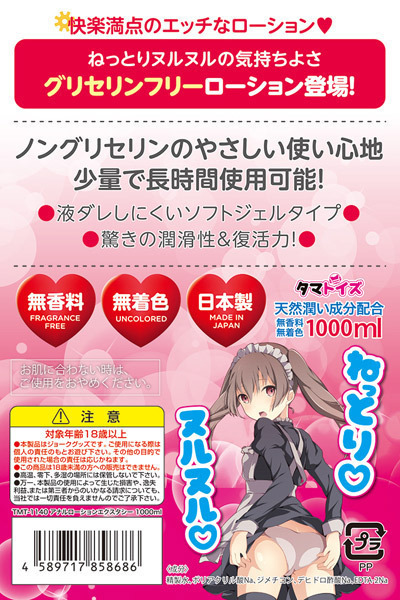 ねっとりヌルヌルの気持ちよさグリセリンフリーローション登場!ノングリセリンのやさしい使い心地●少量で長時間使用可能●液ダレしにくいソフトジェルタイプ●驚きの潤滑性&復活力!無香料・無着色で安心の日本製●使いやすいポンプボトル●メーカー型番:TMT-1140